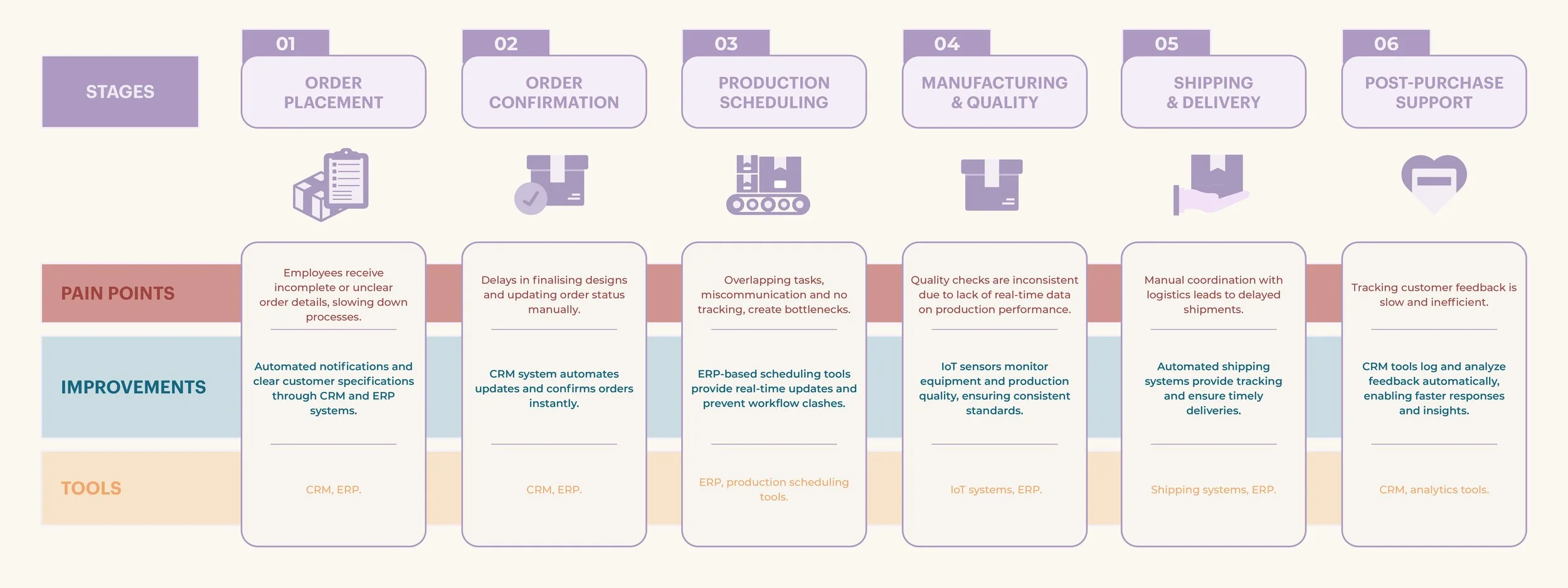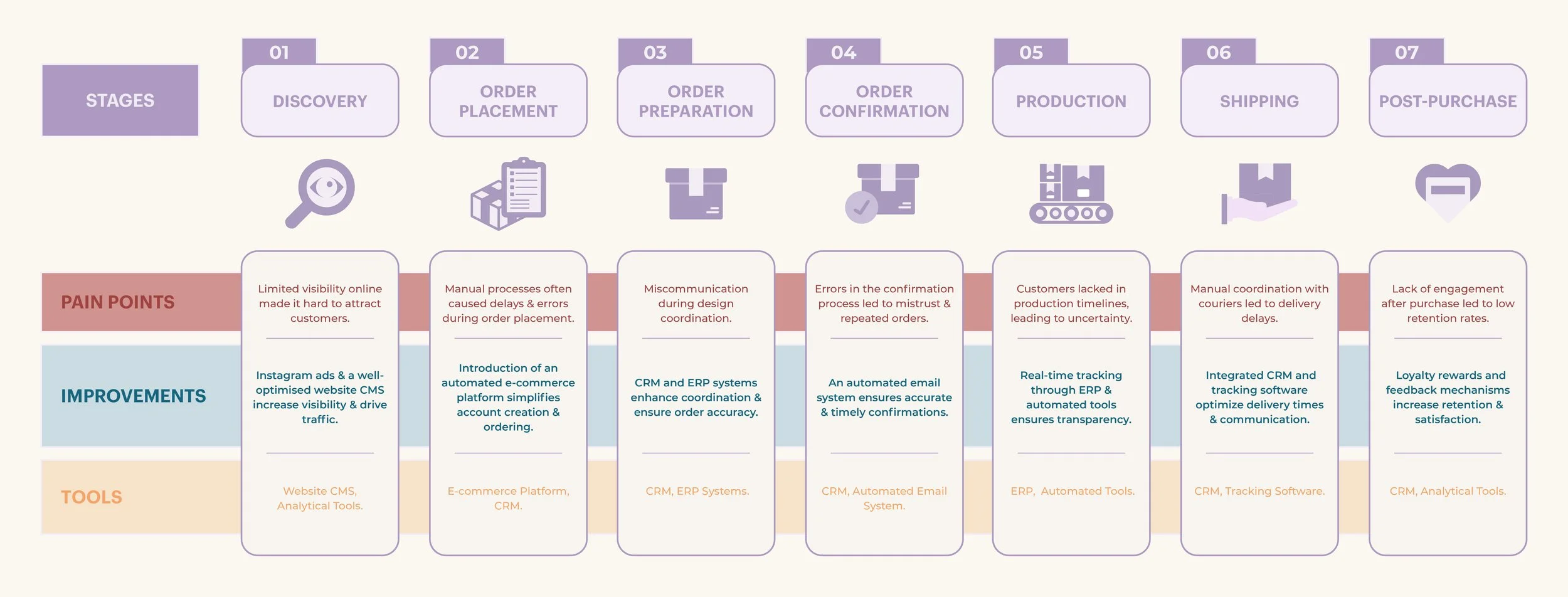 Key touchpoints and tools work together to create a seamless customer experience. An enhanced e-commerce platform enables effortless product exploration and ordering, while CRM systems and automated email tools ensure personalised and timely communication. Real-time tracking provides transparency throughout the production and delivery process, keeping customers informed and engaged at every stage.