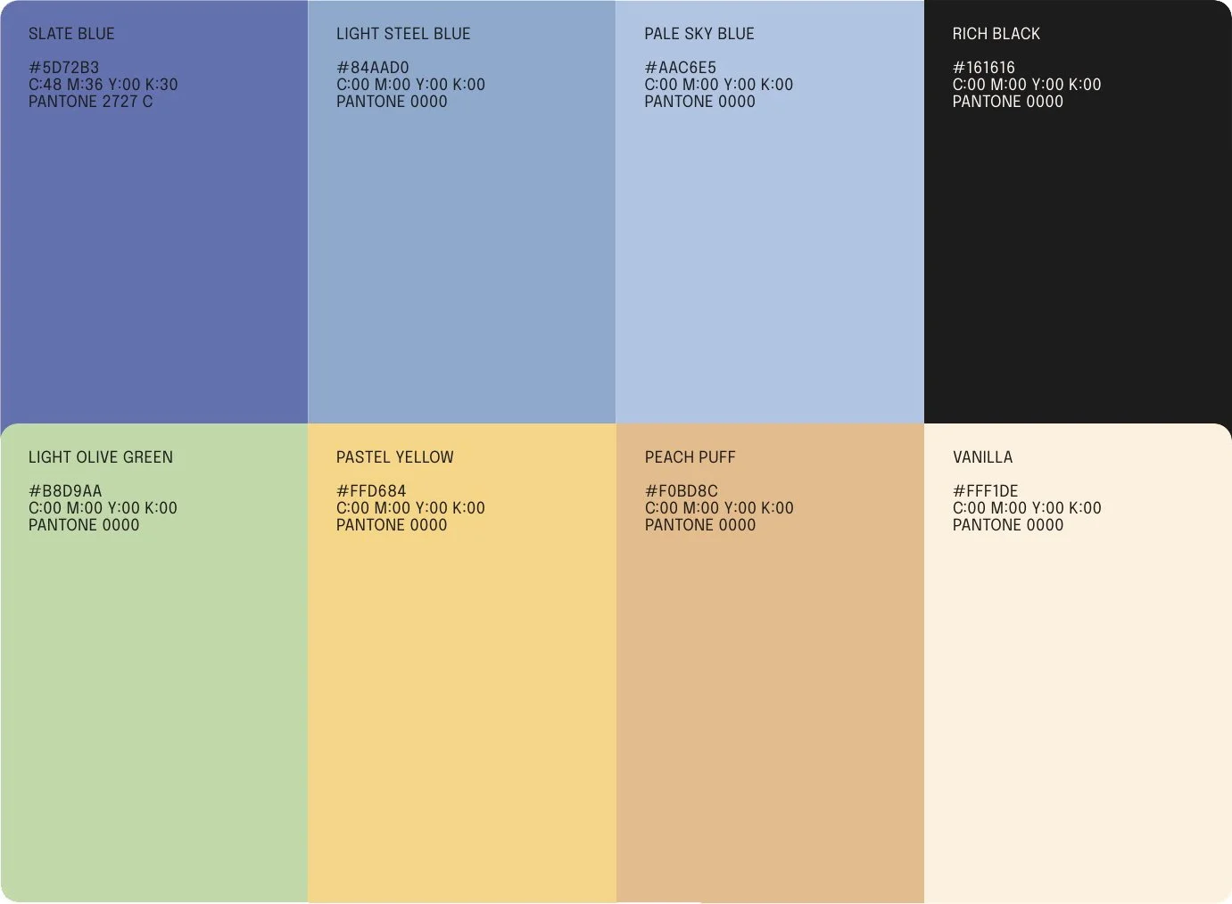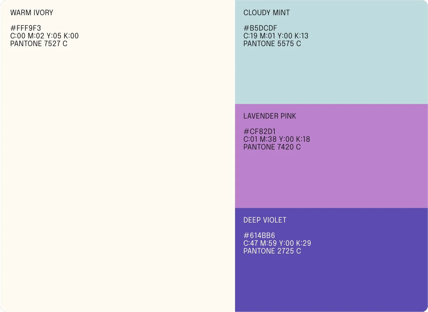 XtoZ’s primary colour palette embodies clarity, innovation, and authority, reflecting its role in digital transformation. Warm Ivory provides a neutral foundation for balance and readability, while Cloudy Mint introduces a fresh, adaptable tone. Lavender Pink injects bold creativity, making the brand feel modern and dynamic, while Deep Violet grounds the palette with a sense of expertise and trust. Together, these colours create a visually striking yet approachable identity.